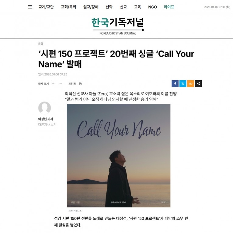[기사] ‘시편 150 프로젝트’ 20번째 싱글 ‘Call Your Name’ 발매(한국기독저널)