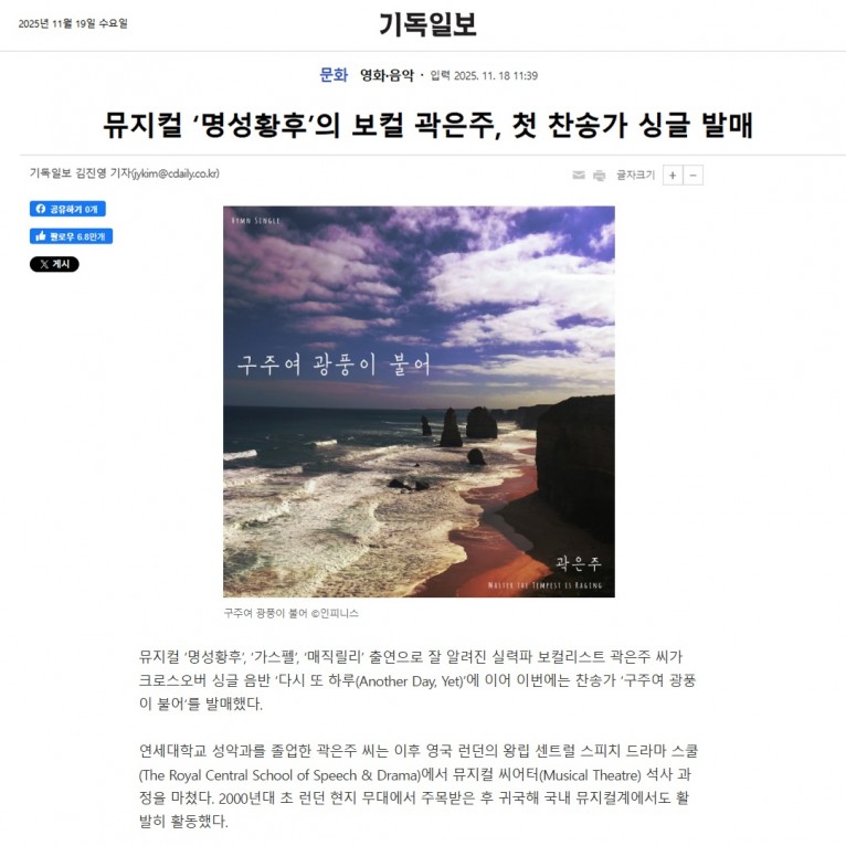 [기사] 뮤지컬 ‘명성황후’의 보컬 곽은주, 첫 찬송가 싱글 발매(기독일보)